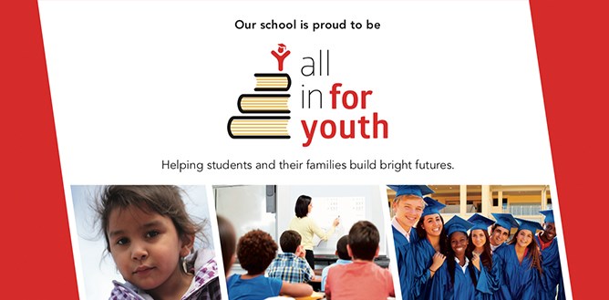 All in for Youth provides supports to students and their families in a unique way, bringing together a variety of programs and services in order to help every child achieve their very best. The program supports students from Kindergarten through to high school completion with the goal to see every child complete high school!